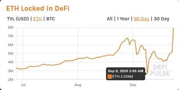 Итак, 2 октября график DefiPulse для объёма общих средств, закопанных заблокированных в DeFi, на продолжительное время превратился в